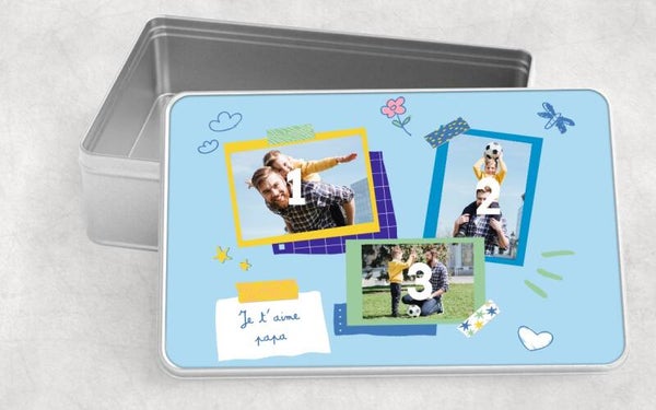 Boîte métallique pour les gâteaux, les bonbons, etc. personnalisée. L'impression est réalisée sur une plaque métallique qui ensuite est fixée sur le couvercle de la boîte.