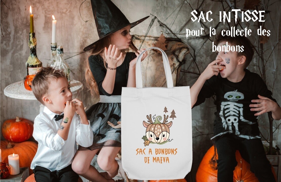 Sac solide et personnalisé, idéal pour faire la chasse aux bonbons le soir d'halloween.