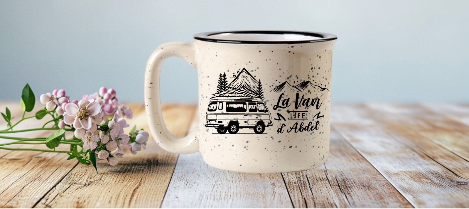 Mug en céramique, émaillé, d’une capacité de 400 ml, beige avec taches sombres et bords noirs.