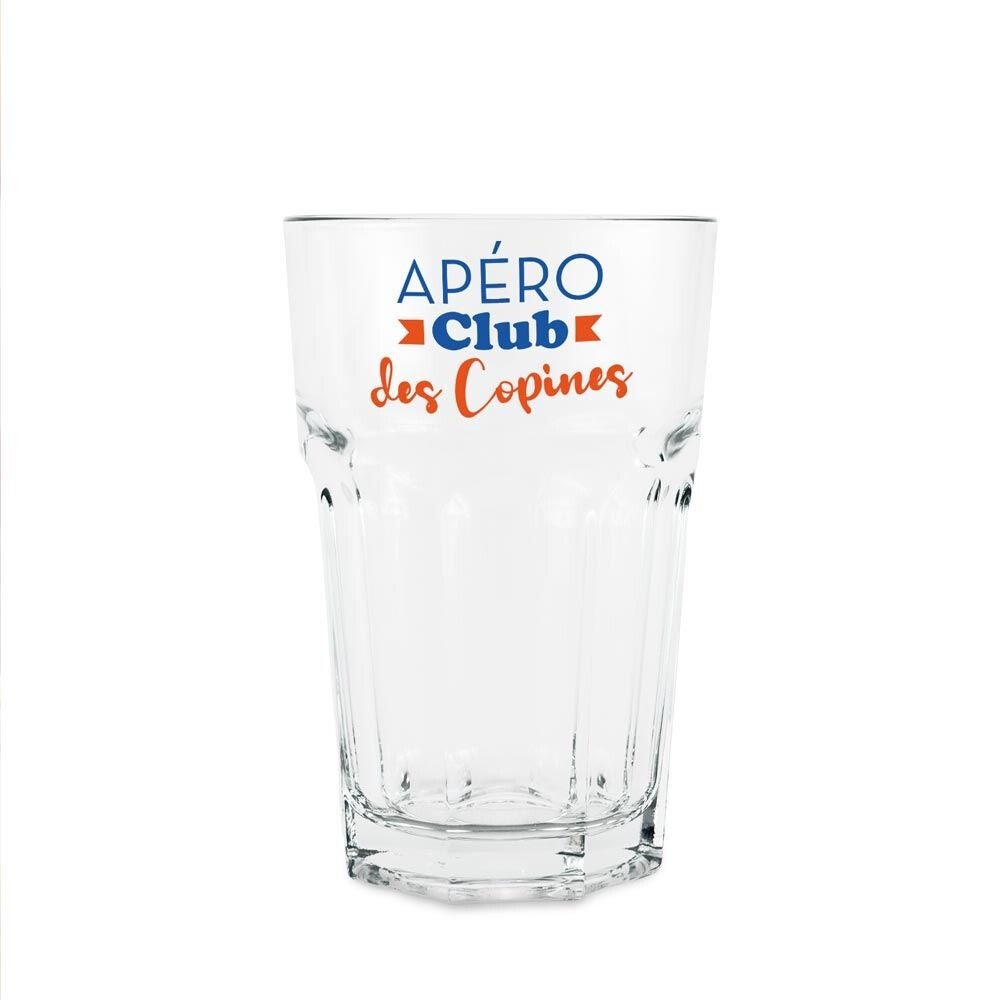 Avec une capacité généreuse de 55 cl, il permet de savourer pleinement vos mojitos et autres cocktails rafraîchissants. La mention festive "Apéro Club des Copines" en bleu et orange ajoute une touche d’humour et de complicité à vos moments partagés.