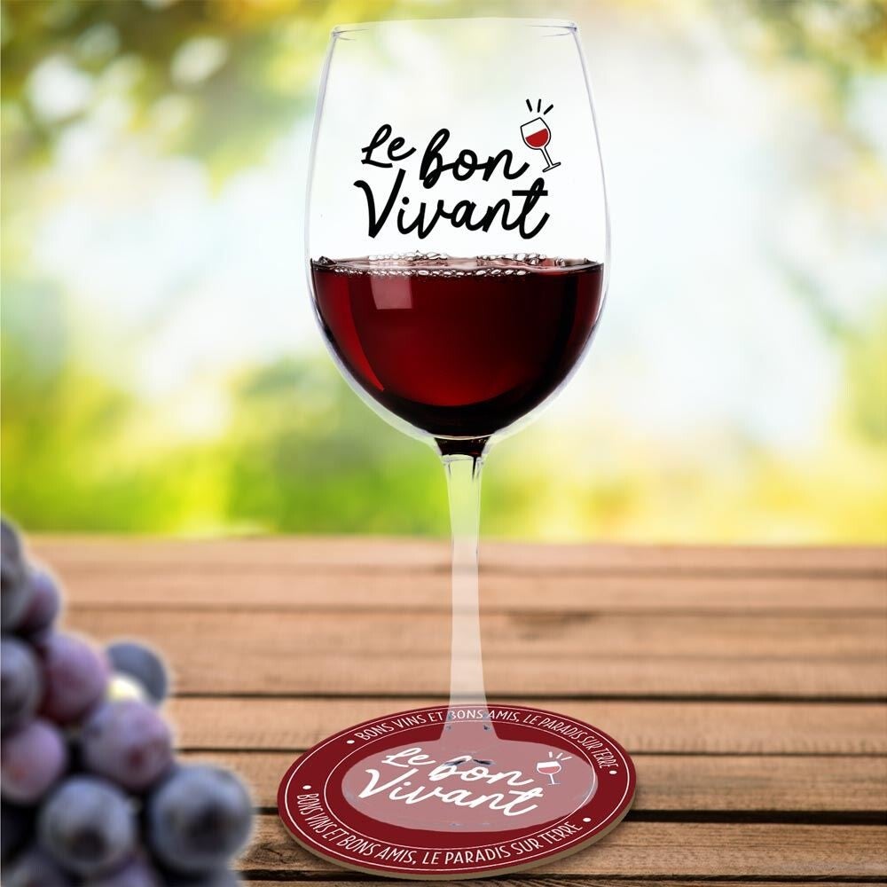 👉 Un verre à vin marqué "Le bon vivant" en noir, pour annoncer la couleur dès la première gorgée.