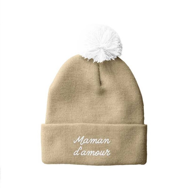 Style travaillé avec broderie « Maman d’amour » → un bonnet qui dit tout haut ce que tout le monde pense 💕.