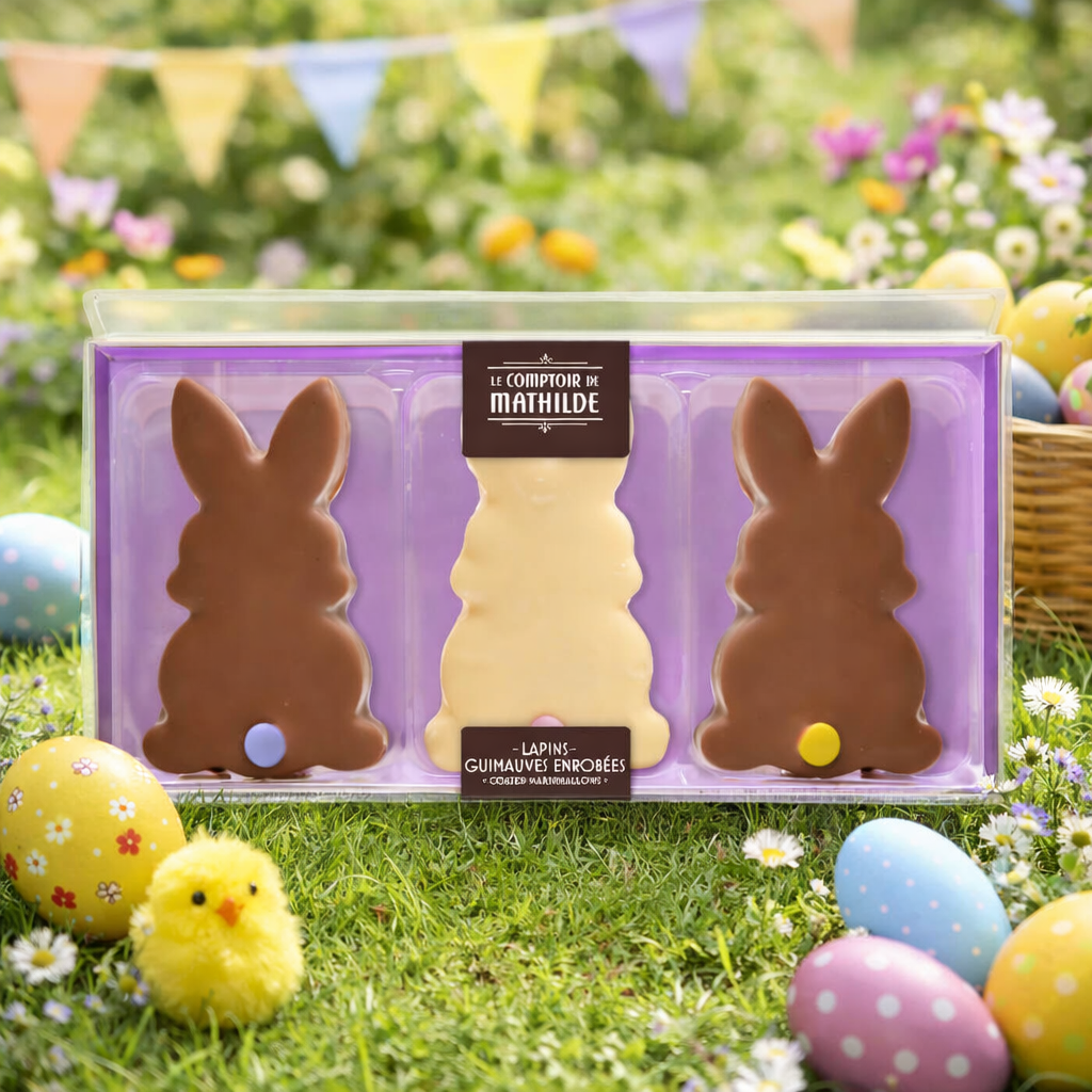 Craquez pour ce coffret de 3 lapins en guimauve enrobés de chocolat lait et blanc, aussi adorables que délicieux.